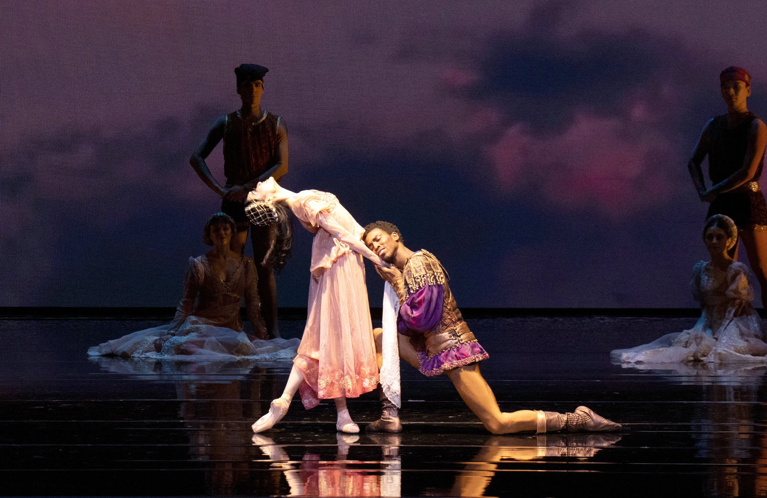 As Cassio, Jake Roxander excelled across his character’s arc from trusted lieutenant to victim of jealousy. His entrance during the celebration saw him employ charming turns and powerful spins after joining the commedia dancers, before shifting to a more cordial affection as he partnered with Desdemona. These qualities were explored further during the second act, from a nice trio of circling measures as Cassio, Emilia, and Desdemona tensely await the returning Othello and Iago by ship, to the extended festivities as Cassio is gradually framed by Iago. There were some truly eye-catching moments as Roxander caught Granlund after being tossed by Whiteside, or handed off mid-lift as Iago further pairs Cassio with Bianca as he readies his trap. Roxander’s time in the court scene of the third act featured great anguish as he was kicked, accused, and finally executed.